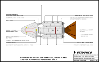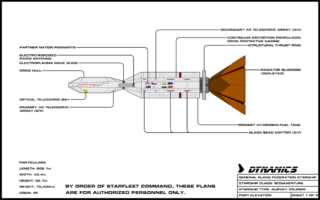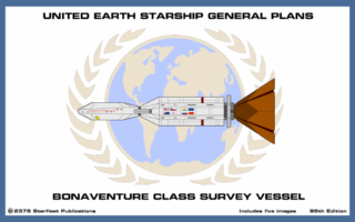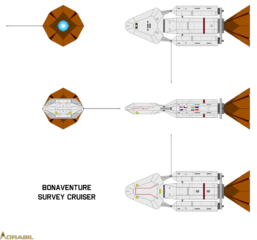 The Bonaventure first entered service with a three-month shakedown cruise outside the Sol system in 2065, before departing to Tau Ceti in 2066. She was 206.1 meters in length, 63.4 meters wide, and 66.7 meters high (when the radiator was deployed in the open position). She massed about 79,400 metric tons. Her warp assemblies allowed for a speedy warp 2 for cruising, with a maximum speed of warp 2.5; her mission endurance was a very impressive six years. She was equipped with one general purpose laboratory, and one dedicated to planetary sciences. The ship’s hull was mottled with hexagonal three-dimensional scanned telescopic arrays and one port-side electro-rigidized deployable radio antenna. Two (previously mentioned) shuttles were bolted to the ventral side of the central fuel tank and two shuttlepods for extravehicular maintenance were stored in the aft cargo bay of the command hull. The ship was crewed by 45 specialists with a gamut of areas of expertise and nations of origin.