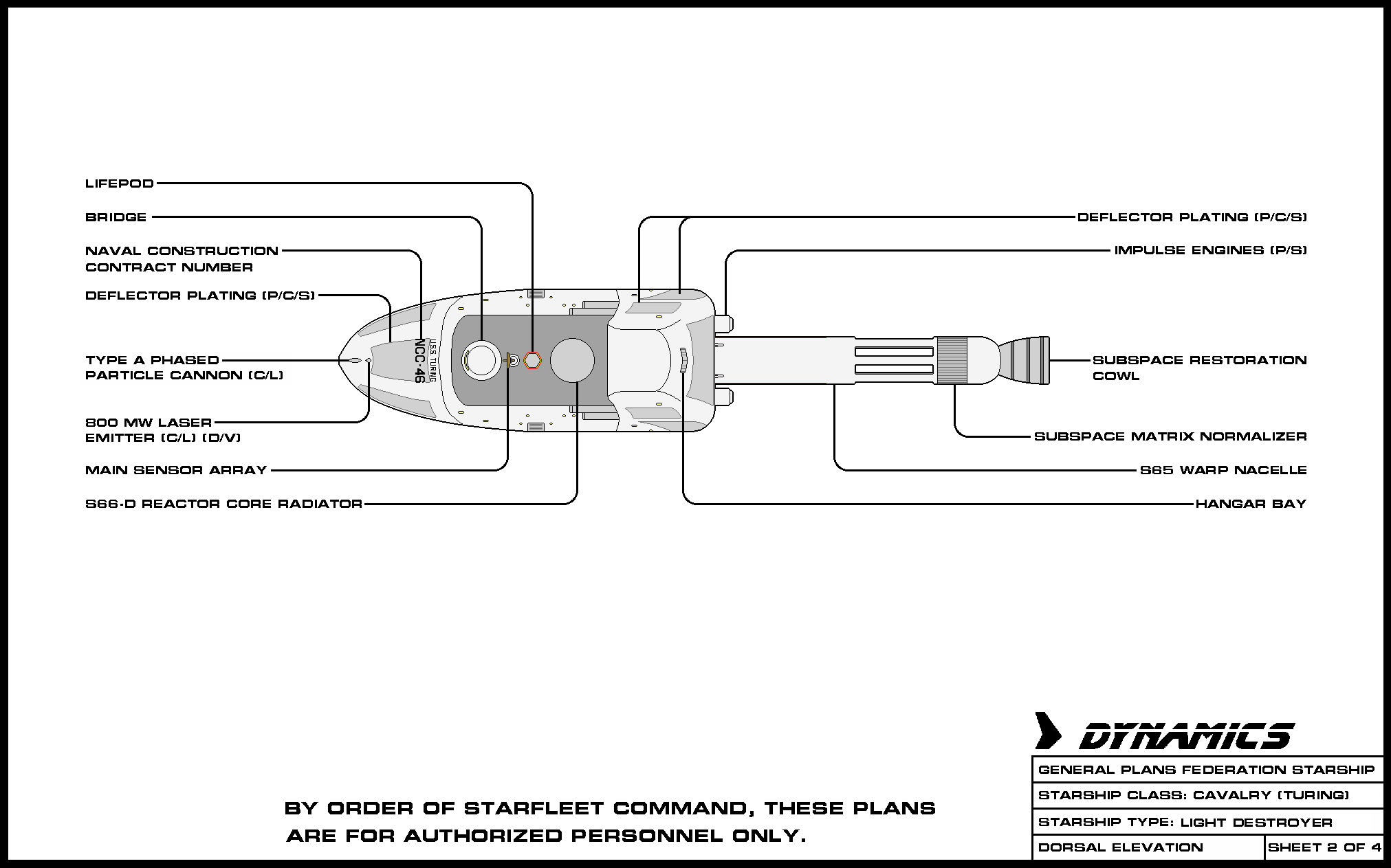 Hence, the Cavalry class light phase gun destroyer was designed to carry four 6-gigawatt plasma cannons on the bow, with a heavy Type A phased particle cannon in the 500-gigawatt range centered on the bow as well. Heavy polarizable armor was embedded on the dorsal fore to allow lined-up strike approaches and, on the ventral side, as protection during the violent banking maneuvers away from the attack run. The warships had one S65 ventral nacelle powered by the S66-D fusion reactor via two sturdy pylons, with a maximum capacity of warp 3.1, more than enough to allow system patrollers to form up for interception runs. The subspace matrix normalizer was deemed a necessary addition to the nacelle itself, as a formation of closely-maneuvering starships would cause localized tetryons to behave chaotically, impacting the stabilization of warp fields on the trailing ships. The waste delta radiation from the normalizer dictated a position as far as possible from inhabited interiors; the open frame just forward of the device helped to reduce unnecessary mass.